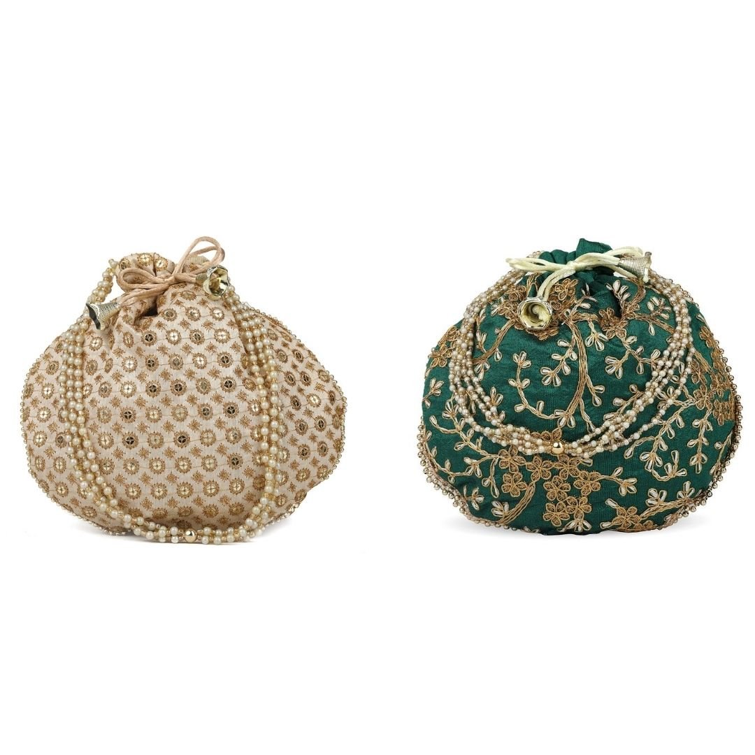 Home W_Bags Potlis PK 2 Combo – Designer Embroidered Potli Bag – Golden & Green