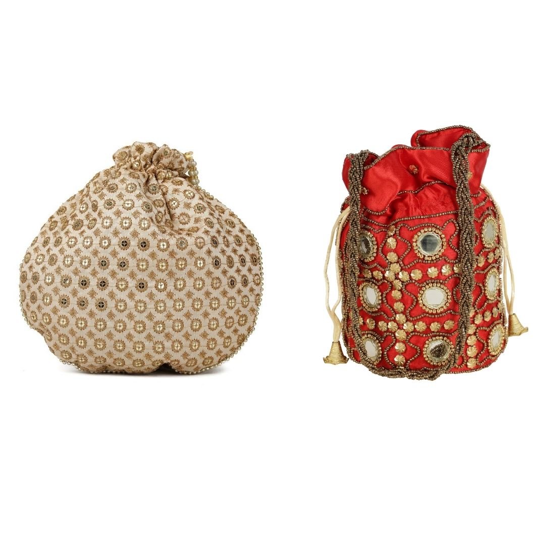 Home W_Bags Potlis PK 2 Combo – Designer Embroidered Potli Bag – Golden & Red